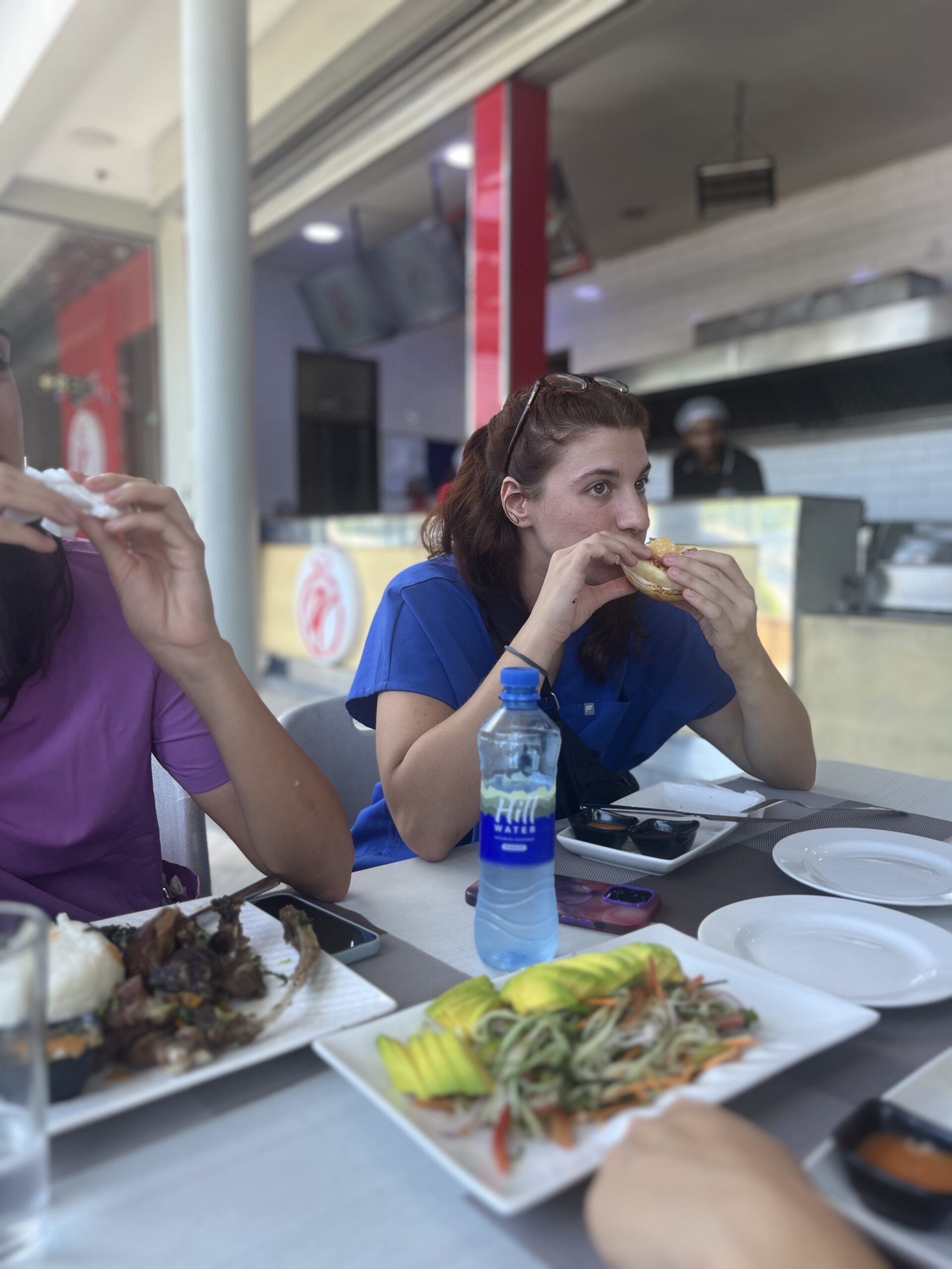 Enjoy lunch at Kukurico, a grillhouse down the street from the volunteer homestay. Burgers, chips, and salad is on the menu today.