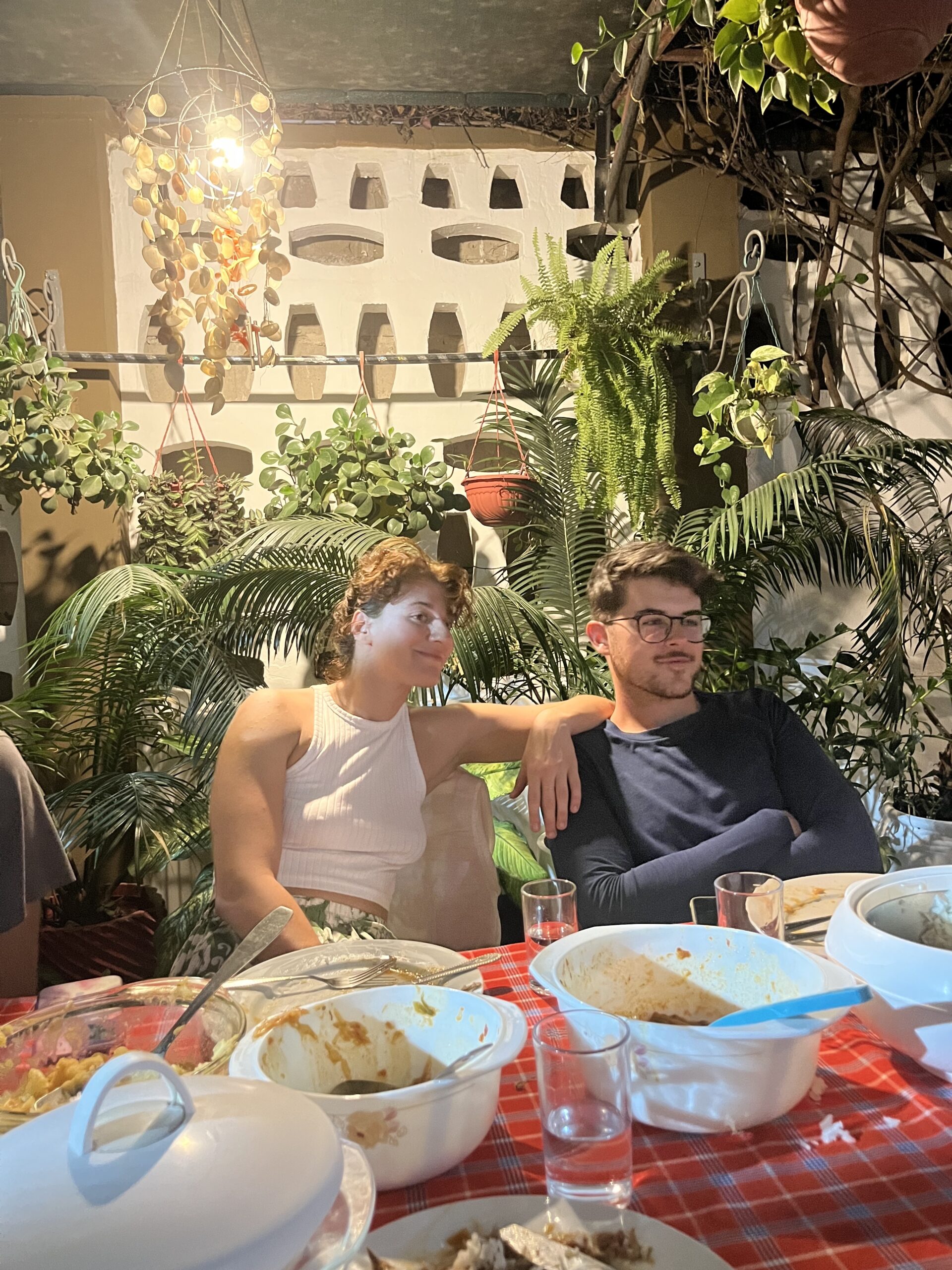 Dinner at the volunteer house with the whole crew. Our volunteers get delicious, traditional Tanzanian food each evening, like rice, coconut beans, noodles, chapati, chicken or beef makange, and sautéed greens.